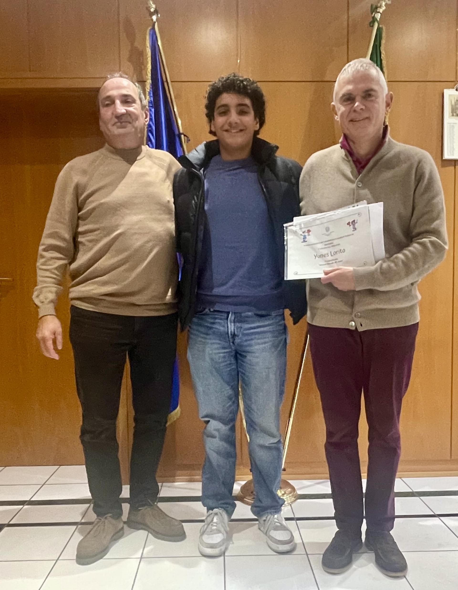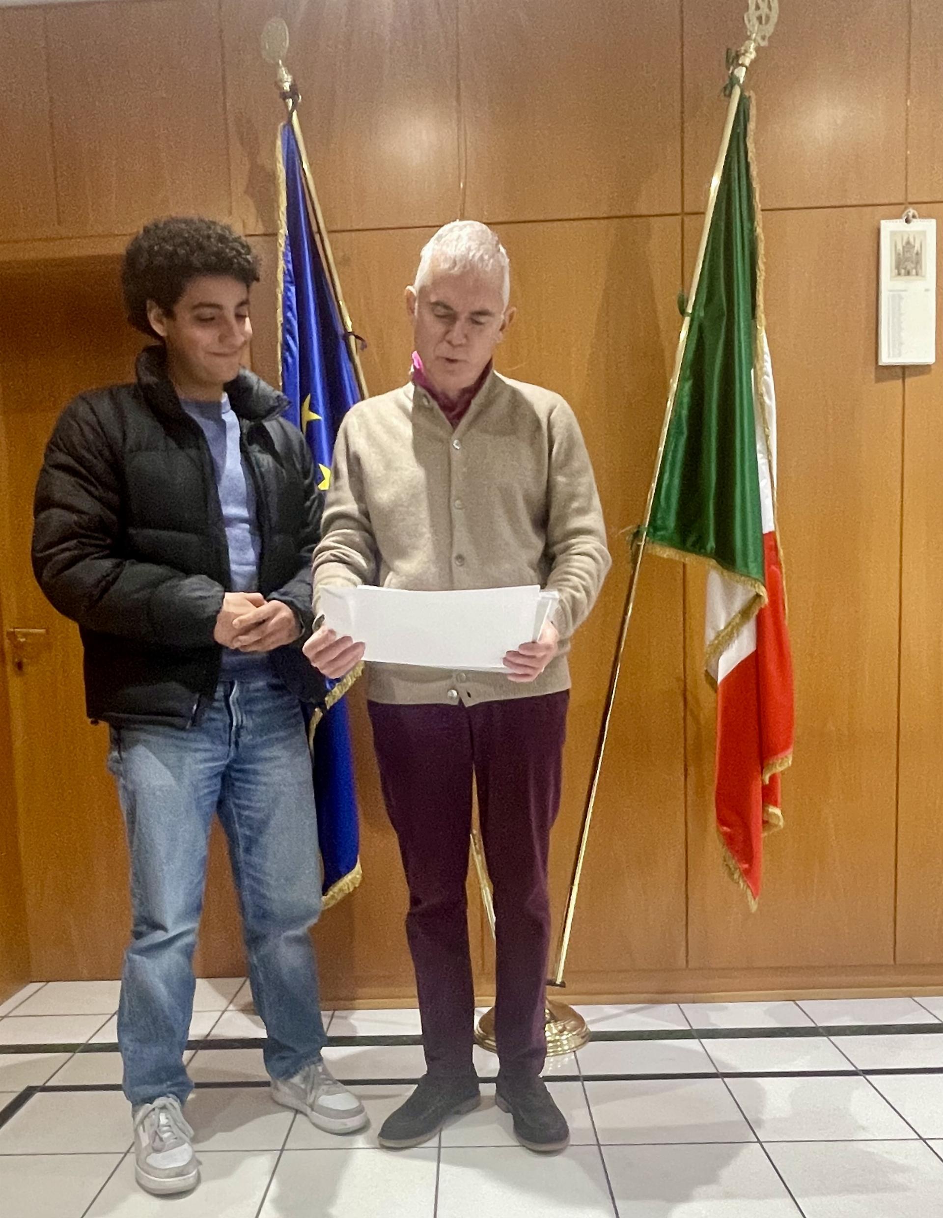 Il Console Generale Massimo Cipolletti ha premiato Yunes Lorito, tra i vincitori nella categoria “Ginnasi fino alla 10a classe”, e gli ha consegnato un premio in denaro, messo a disposizione da Ferrero Deutschland.